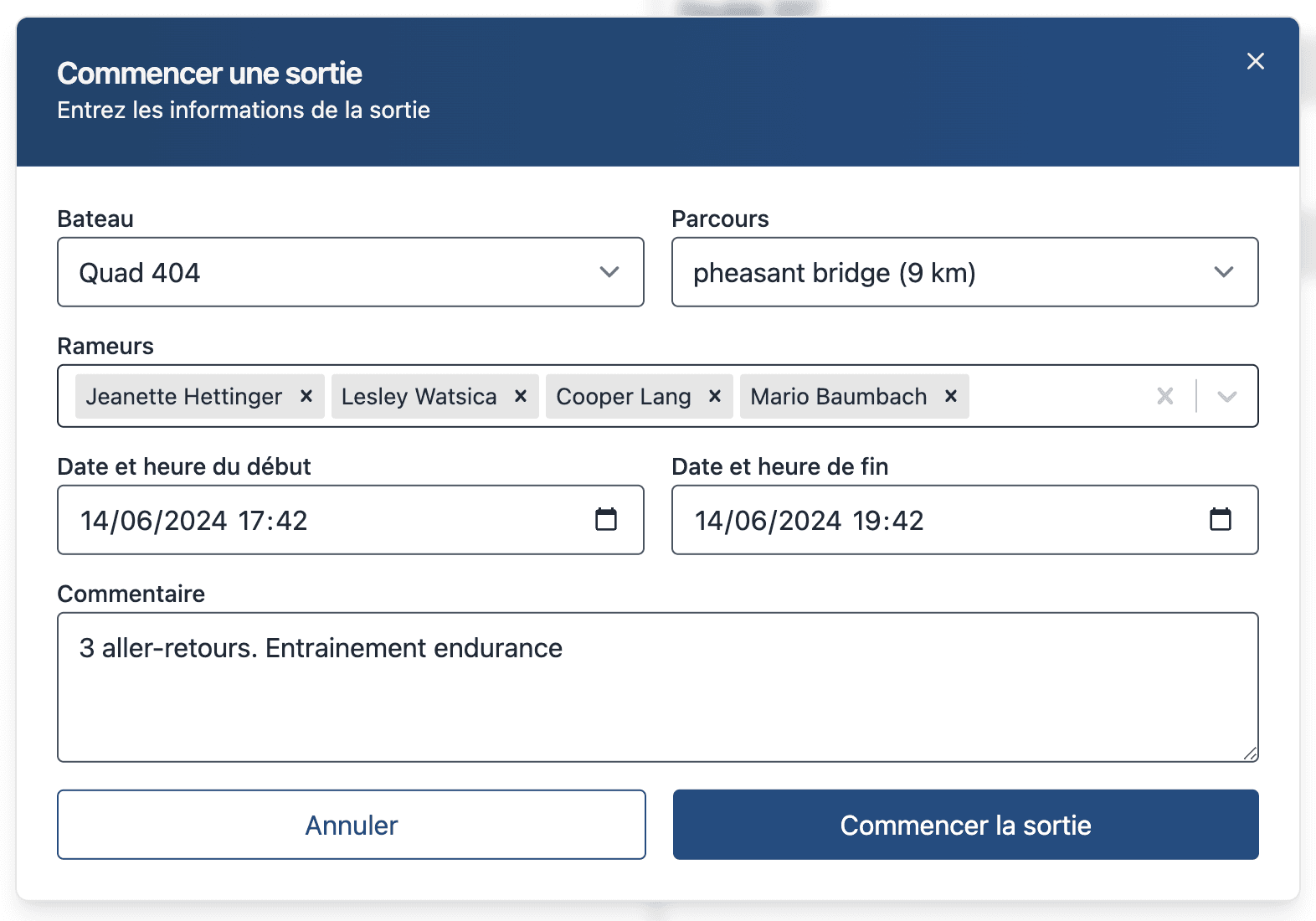 Grâce à une interface simple et intuitive, les rameurs peuvent enregistrer leur sortie rapidement. Tous les rameurs, les bateaux et les parcours sont pré-enregistrés, il suffit de sélectionner les bonnes valeurs.
